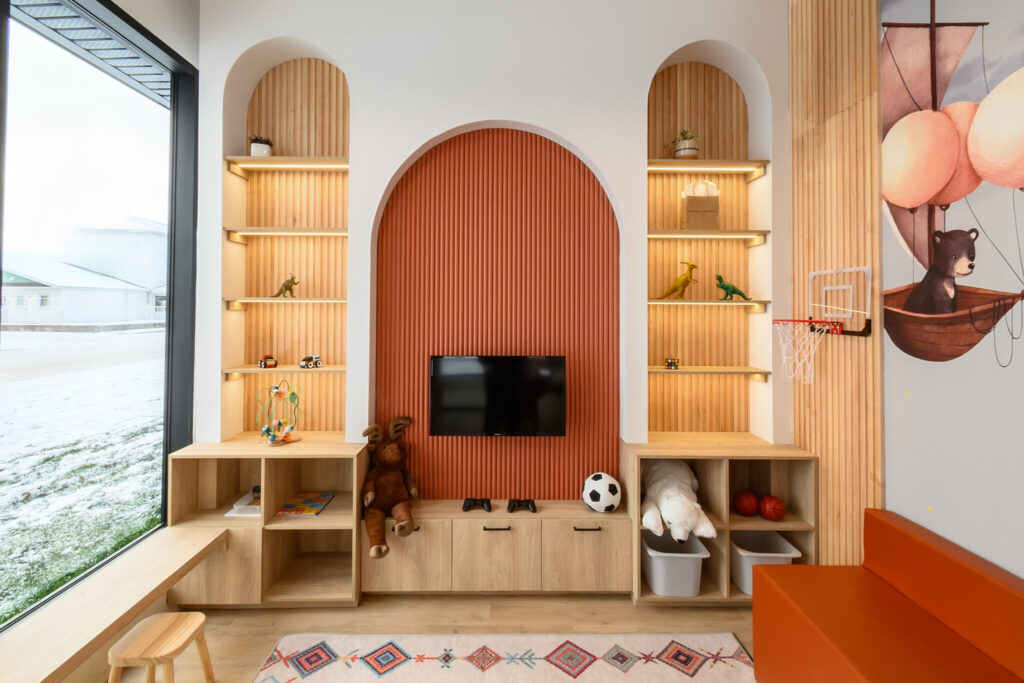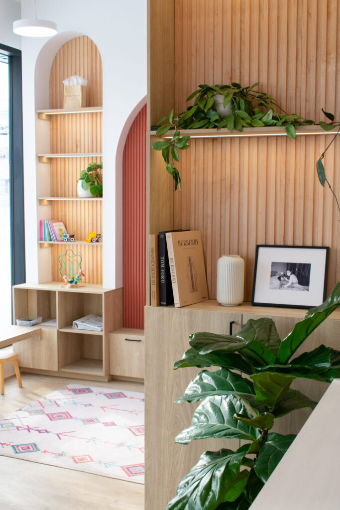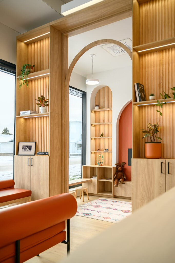 The thoughtful contemporary design blends clean lines with warmth, texture, and soft architectural details. Sculptural wood slat walls and gently arched niches create a natural rhythm that guides workflow and brings a sense of visual calm throughout the space. Terracotta toned feature panels and light wood millwork add depth and character while maintaining a bright, cohesive overall aesthetic. The front desk is an eye-catching focal point that is wrapped in vertical wood detailing with rounded corners that model organic forms in nature. In the reception area, built-in shelving framed by curved millwork introduces playful décor that creates a more engaging experience for younger patients. The operatories balance precision and comfort with white cabinetry, warm toned chairs, and generous windows that fill each room with natural light. The overall design theme supports caring connections and comfortable experiences for patients, team members, and anyone who visits the office.