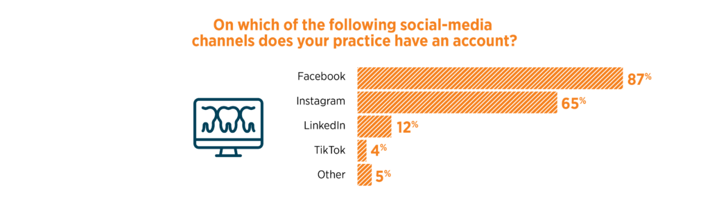 Despite being one of the oldest major social platforms still in widespread use, Facebook remains the clear leader. Among practices that use social media, 87% report having a presence on Facebook, making it the most widely used platform among dental professionals.