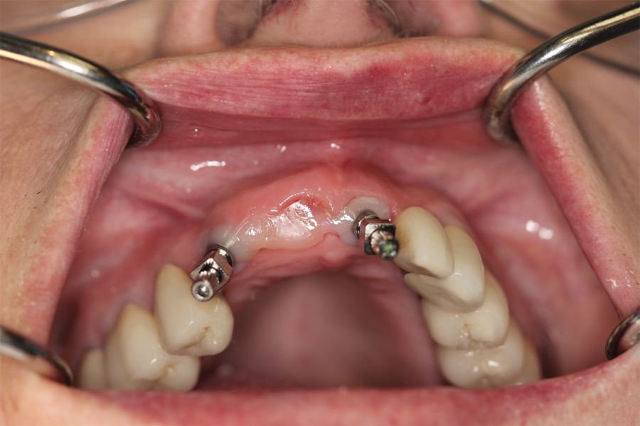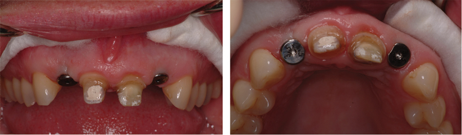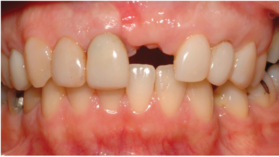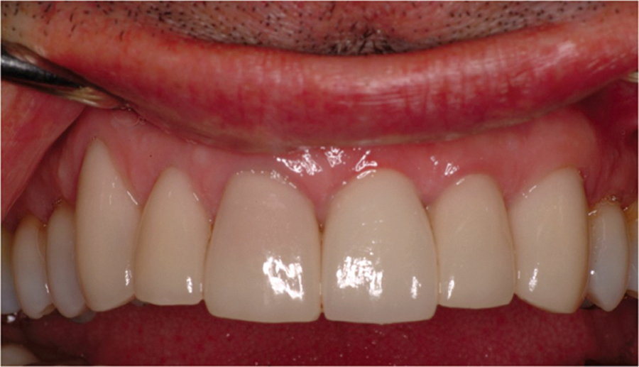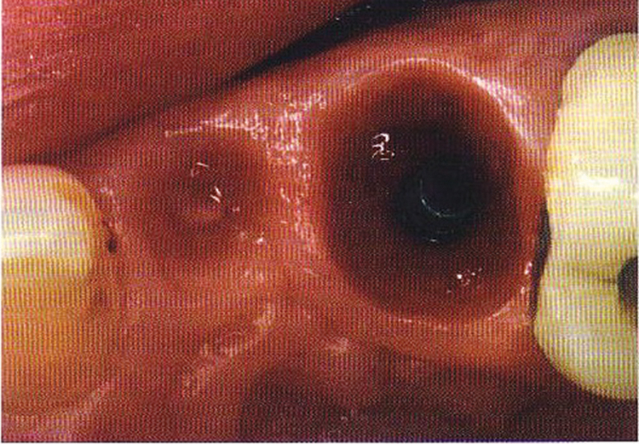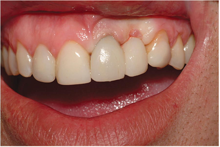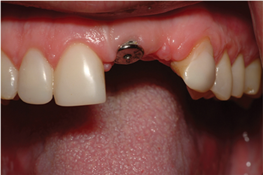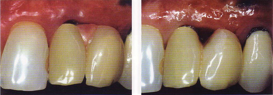 Saad A et al Nonsurgical management of interdental papilla associated with multiple maxillary implants. Journal Prosth, 2005; 93: 212-215. The patient had received two adjacent implants in the #22 and #23 position. Predictably the final result was an esthetic failure. Maximum tissue height between two implants is only 3.5 mm. Result was predictably an esthetic failure.