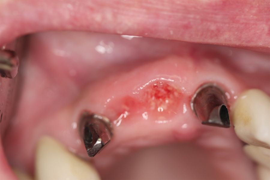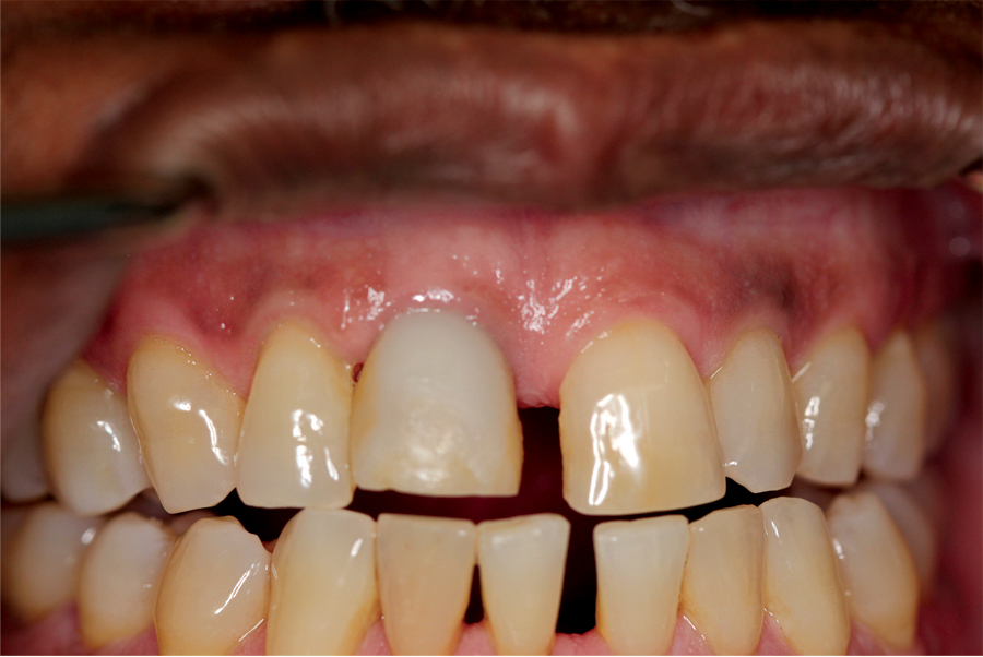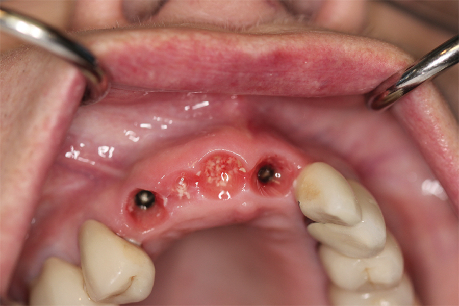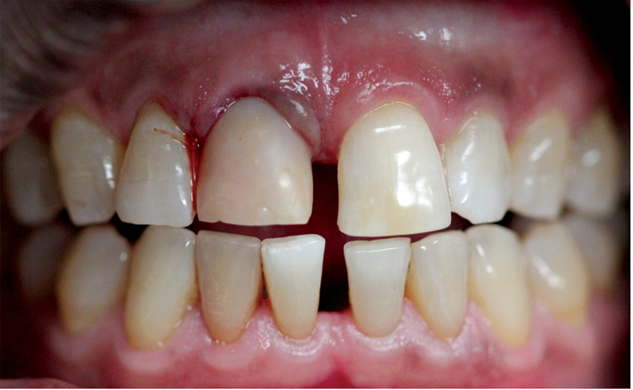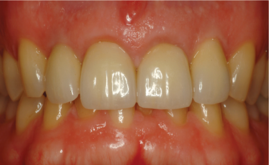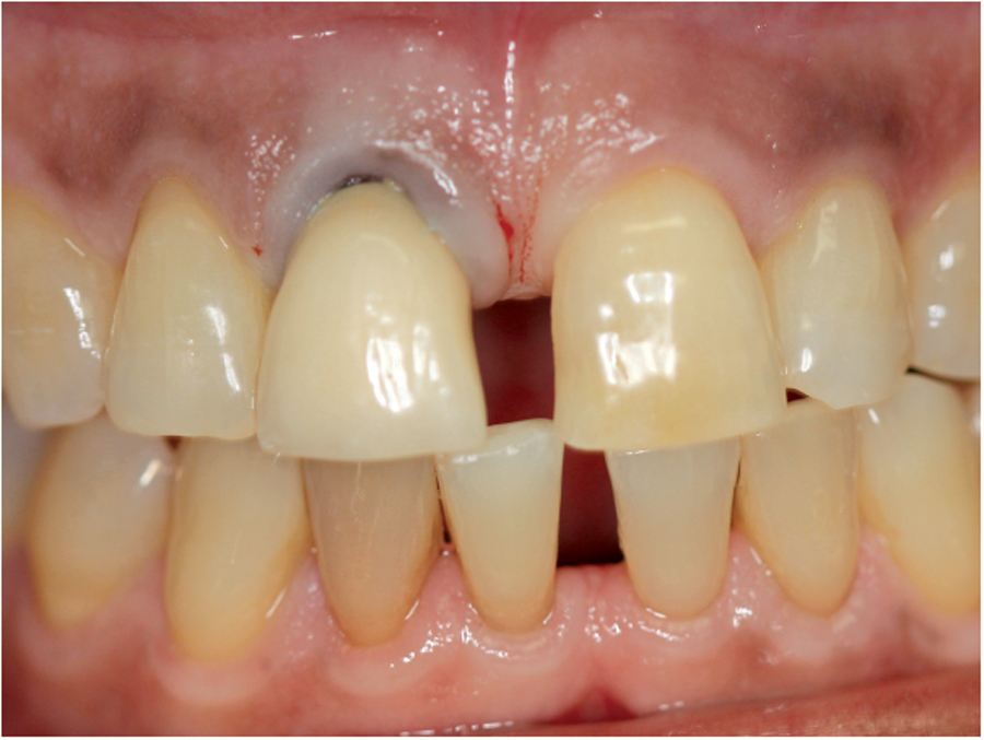 Saad A et al Nonsurgical management of interdental papilla associated with multiple maxillary implants. Journal Prosth, 2005; 93: 212-215. The patient had received two adjacent implants in the #22 and #23 position. Predictably the final result was an esthetic failure. Maximum tissue height between two implants is only 3.5 mm. Result was predictably an esthetic failure.