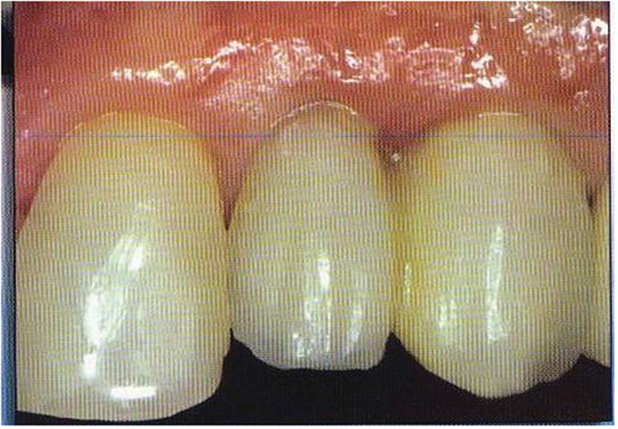 The extra 1.5 – 2.0 mm of tissue height interproximally is due to the interproximal contact factor and is a direct result of compression of interproximal tissue between adjacent teeth which effectively ‘squeezes’ 1.5 to 2.0 mm of tissue height beyond the midfacial height, giving rise to the 5.0 mm papillae criterion as referenced by Salama/Garber6, Tarnow7 and Choquet4. It is this interdental tissue height of 4.5 to 5.0 mm above the osseous crest that we refer to as the interdental papillae. Recently Hae-Sung Cho8 et al reviewed the effects of root on the existence of interdental papilla and found that root proximity has a direct effect on the presence of papilla.