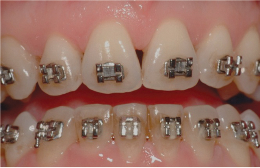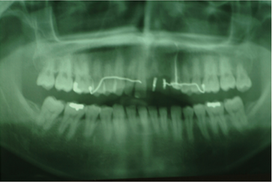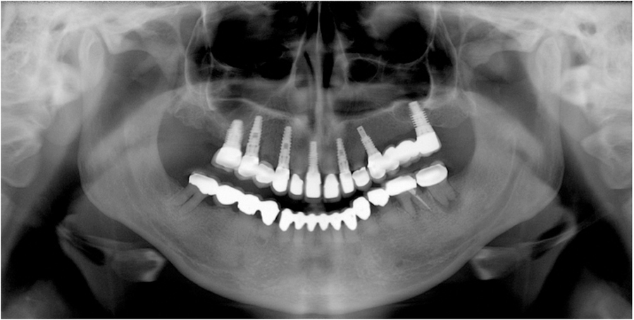 Patient presented for loose front left central incisor. Examination revealed drug-induced Xerostomia, moderate to severe caries in teeth #13, 12, 11 and 21 (Figs. 44, 45). Treatment option included attempts to salvage teeth with root canal therapy, crown lengthening procedures and new post core and crown restorations. This option would involve either orthodontic forced eruption procedures or esthetic mutilation of free gingival tissues. Prognosis would still carry high risk for future caries, (Xerostomia) and create poor esthetics or permanent BW violations and inflamed unesthetic crown margins.