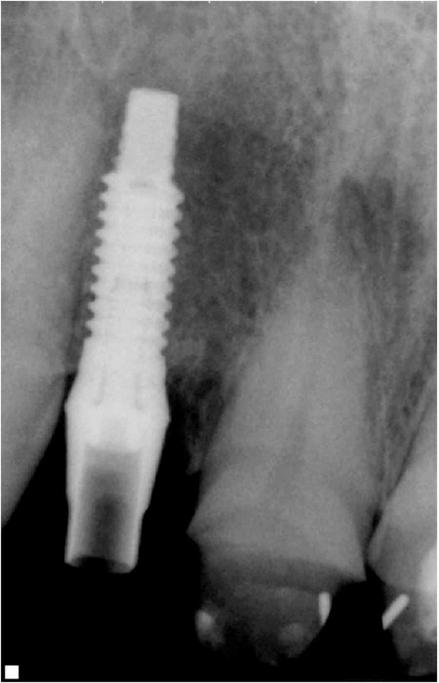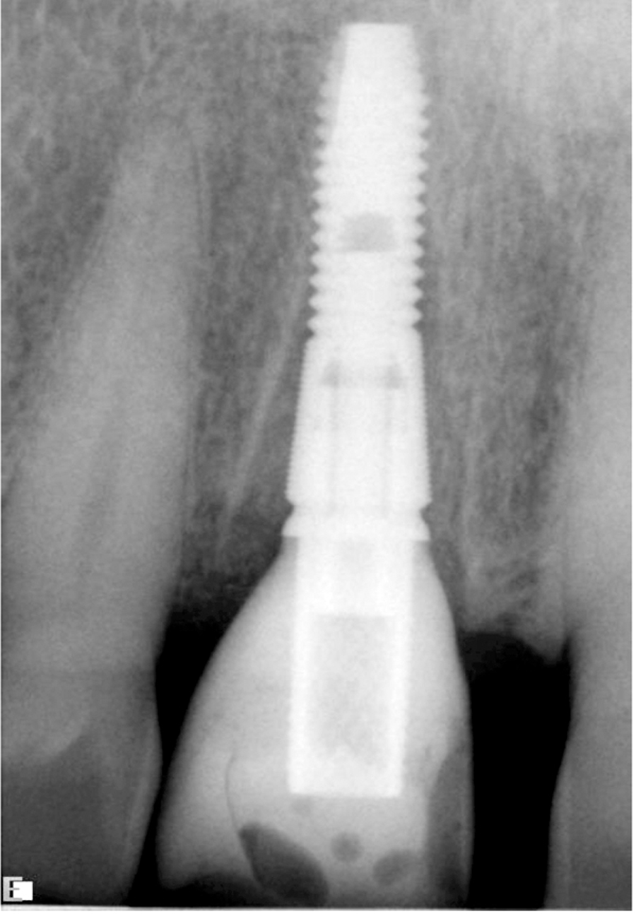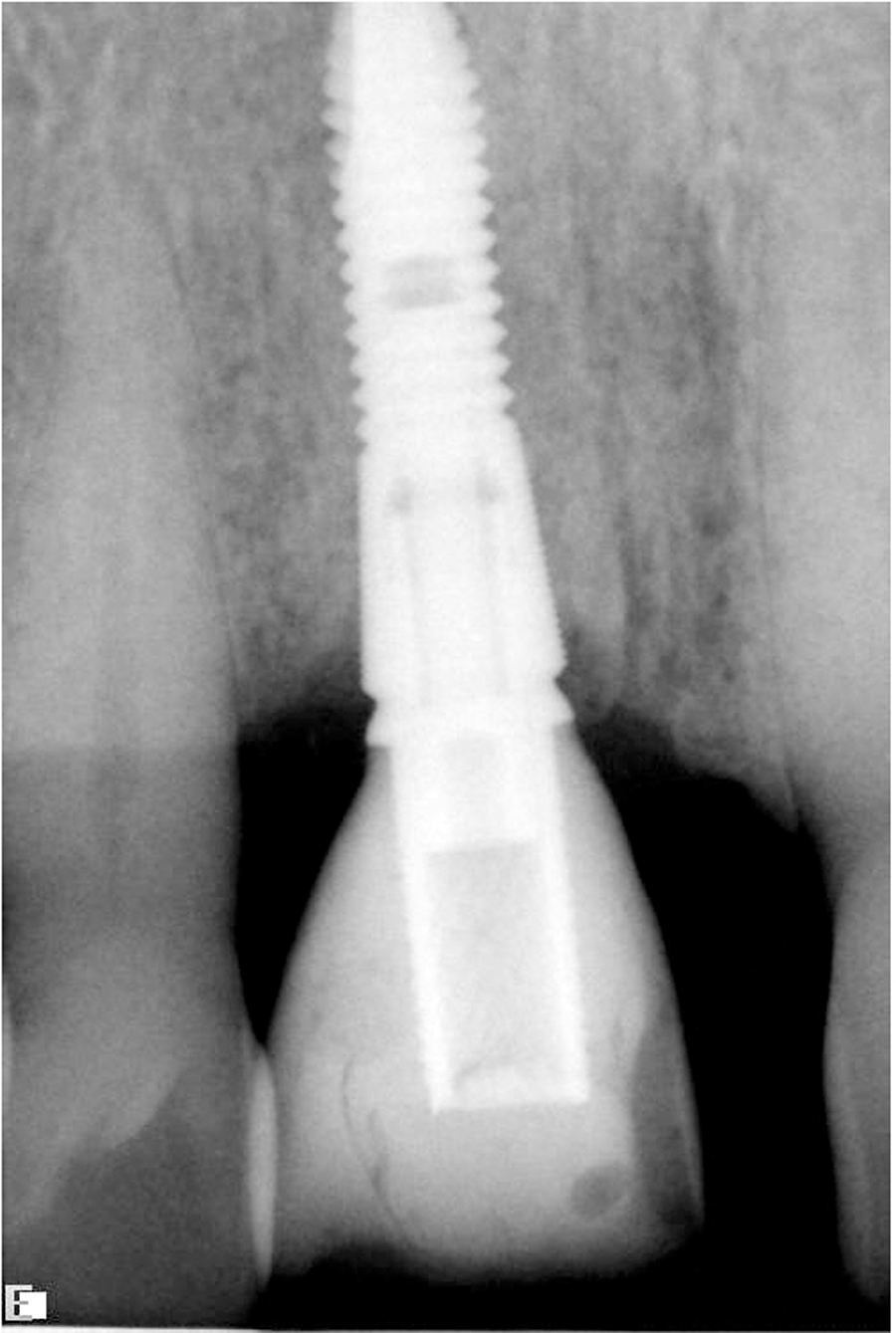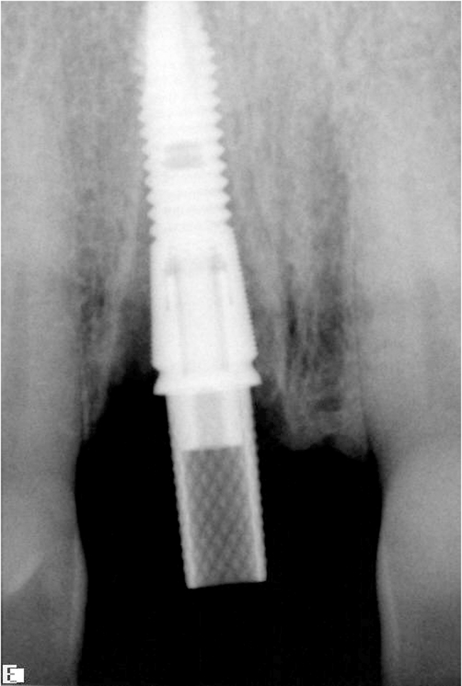 When it is necessary to extract a tooth in the esthetic zone, immediate implant placement and delayed implant placement options exist. Immediate implant placement provides for shorter treatment time and improved patient acceptance (one surgery versus two) but the risks are significant and include increased risk of perforation, bone loss, or failure of osseointegration and loss of implant. However, when ideal conditions do exist, it may be more desirable and more predictable to place implant immediately after extraction.16, 19,20,21,22,23,24. Ideal conditions exist when soft tissue and hard tissue, (both labial and palatal), are present after extraction. The implants should be placed slightly palatal; implants in a more labial position are more prone to resorb the labial plate.17 Ideally 2.0 mm of bone labial is necessary to prevent recession.17 Moreover, when primary stability of implant is possible (50 Ncm), and when the restoration can be kept out of function the implant should be immediately be restored with provisional. The immediate provisional restoration should be screw retained and not removed for six weeks.18
