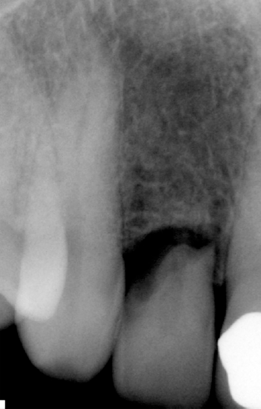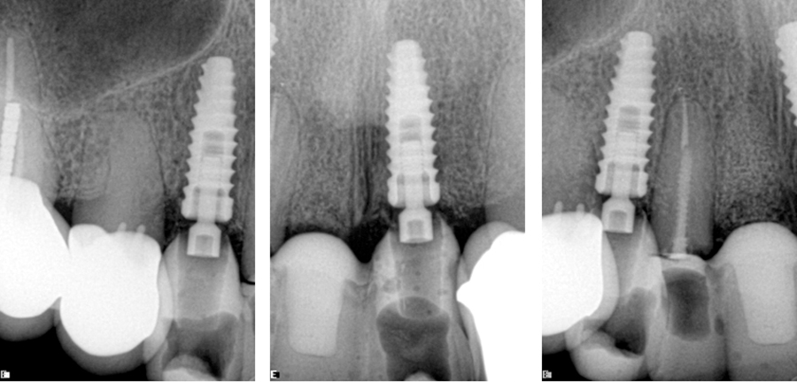 The next case demonstrates the steps taken in the treatment of a failing right maxillary central incisor with an immediate implant and immediate provisional. All options were discussed with patient prior to treatment. (Note the 12-month post extraction response of the bone around the implant).