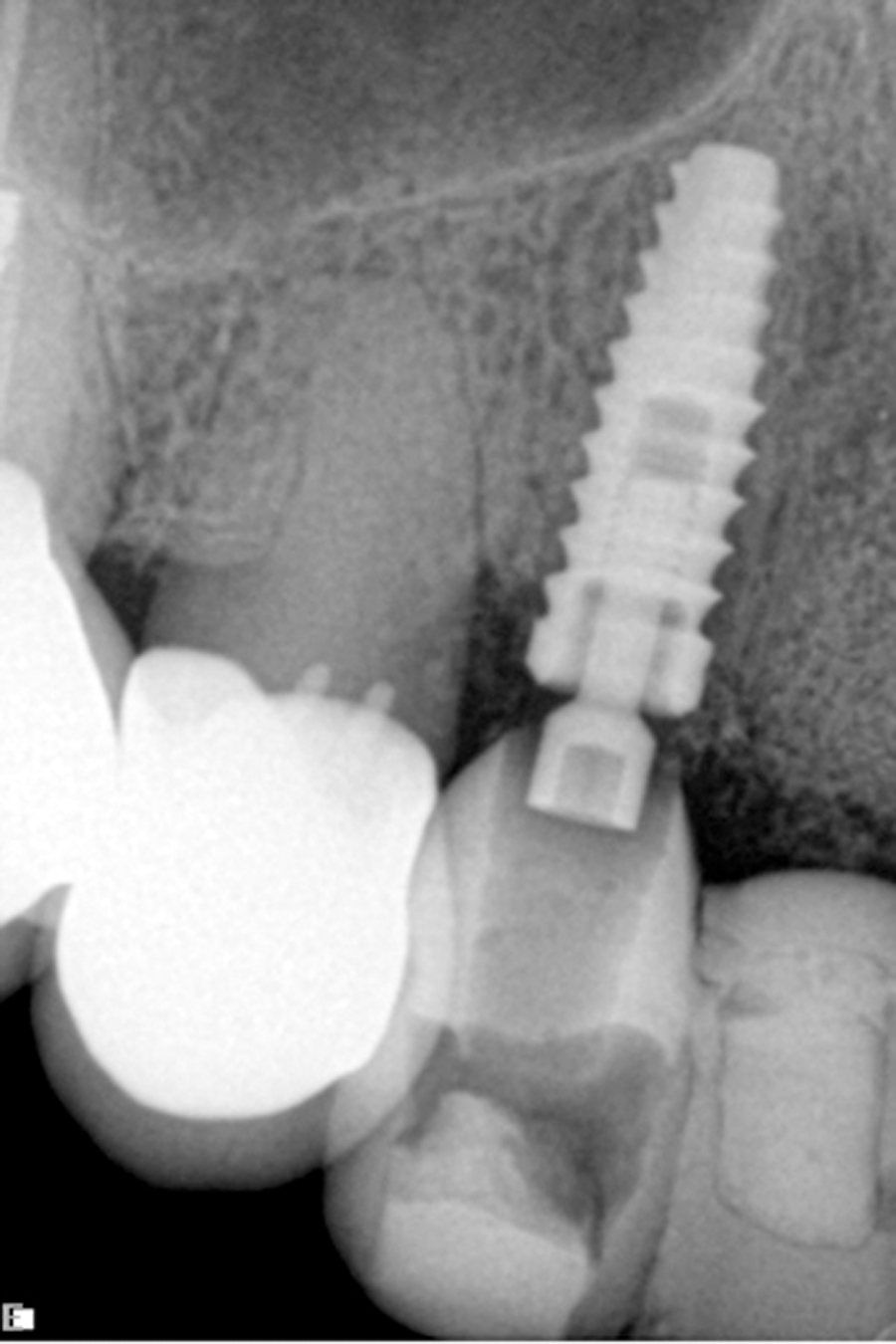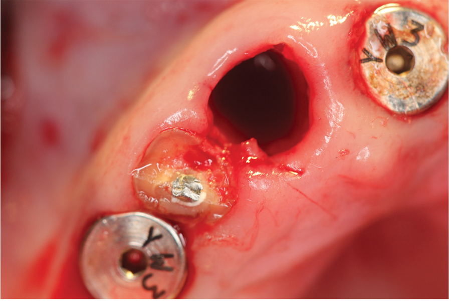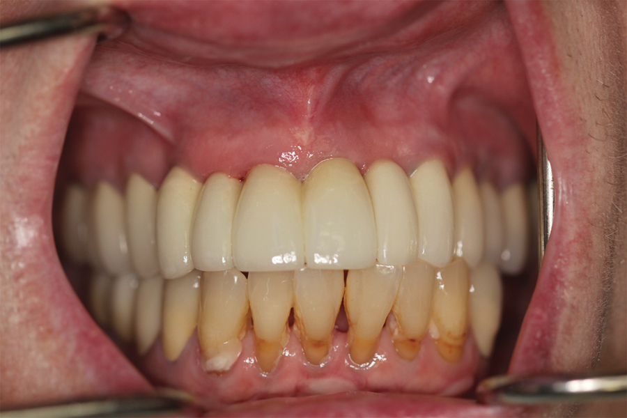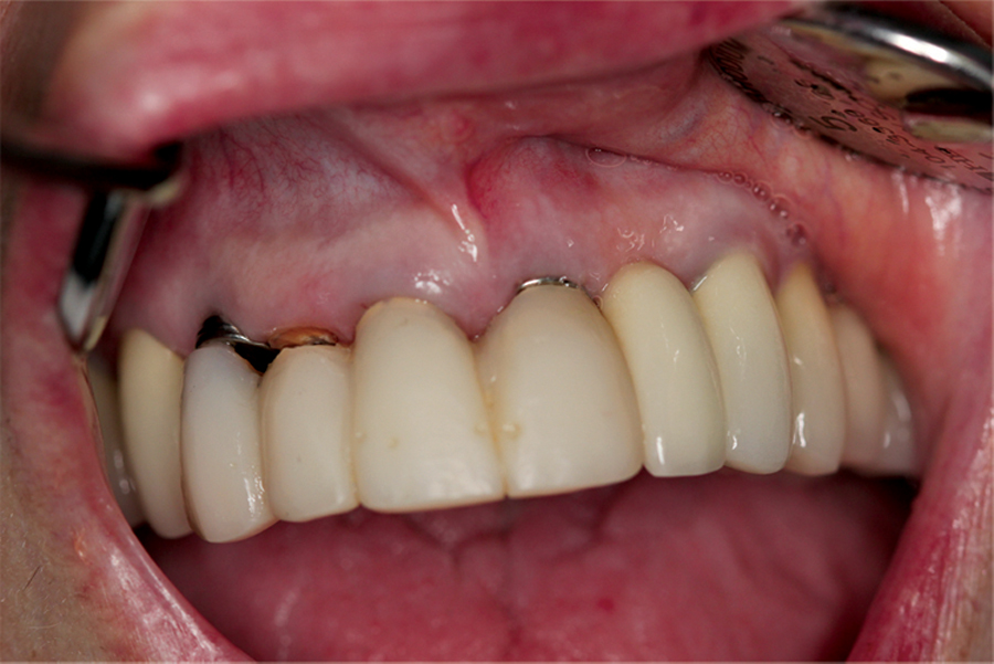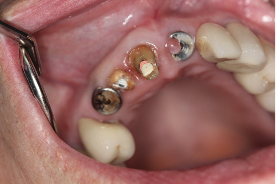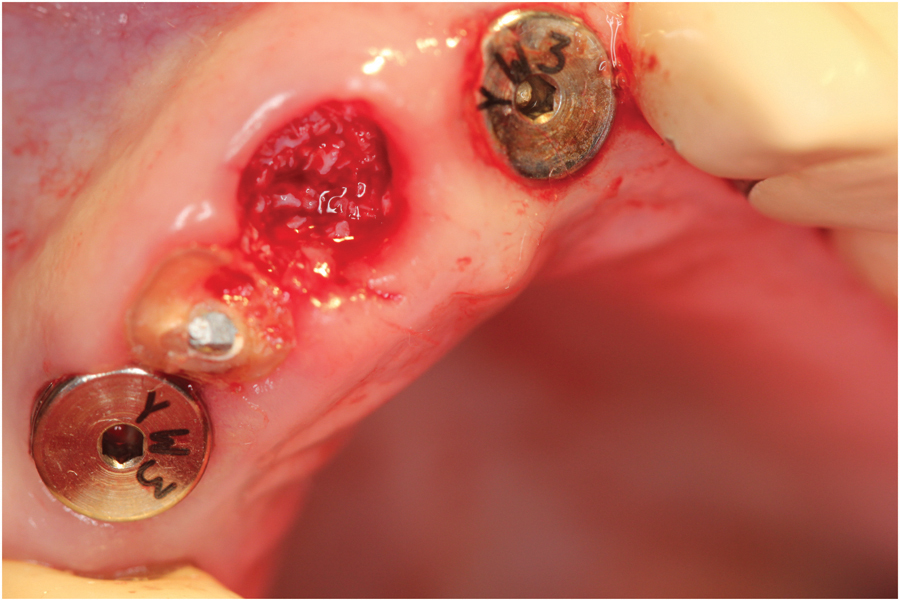 The patient had received two adjacent implants in the #22 and #23 position. Predictably the final result was an esthetic failure. Why? Firstly, interdental bone requires blood supply and adjacent implants compromise blood supply.13 Secondly, the BW; that minimum amount of soft tissue (vertical and horizontal) whose primary function is to insulate the underlying bone both, from the outside environment is sub-crestal around implants, reducing the ultimate height of the papilla. Bone will be lost in both dimensions until this criterion is met.11,12,13,15,16 The author recognized this and buried the #22 implant to create a pontic instead and allow soft tissue to granulate into the site as a means of BW enhancement (increased insulation) around the remaining exposed implant.