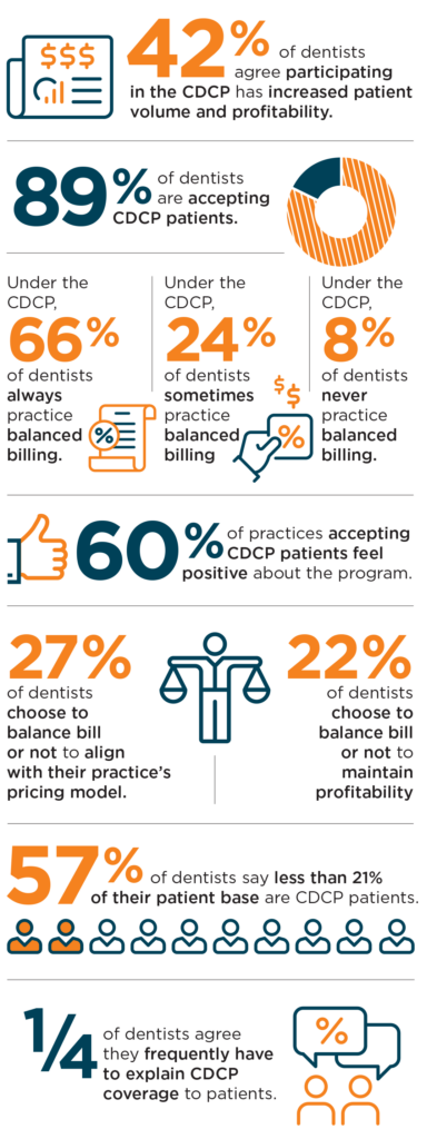 Balance billing occurs when dentists charge patients the difference between the Canadian Dental Care Plan’s (CDCP) reimbursement rate and the dentist’s standard fee. Whether to balance bill is entirely at the discretion of the practice owner.