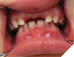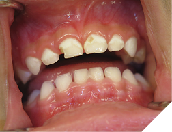 ECC occurs in young children who are fed nocturnally on demand with a fermentable carbohydrate, typically milk. Night-time feeding, whether by bottle or breast feeding, before the eruption of the maxillary incisors is not problematic. Taking a baby bottle during the day, no matter how frequently, does not seem to cause this problem. Feeding a child with a baby bottle before going to sleep is also not problematic. This may be due to the self-cleaning action of the salivary flow during the daytime. With EEC there is reduced salivary flow at night, so the substates are not washed away, but stay on the surface of the teeth. The substances in the bottle also have an effect. The more carbohydrates, the more virulent the decay. A sweetened drink such as apple juice is worse than milk, which is worse than natural breast milk. The substate stays on the tooth surface all night and is replenished regularly by repeated feedings. Why are the maxillary incisors so severely decayed, while the mandibular incisors are virtually immune with ECC? The mandibular incisors are largely unaffected due to the position of the child’s tongue while feeding. As the child sucks on the bottle, the tongue covers and protects the mandibular incisors. The primary incisors when newly erupted are not yet fully calcified and may explain why the decay progresses so quickly. The maxillary first molars may be involved but the maxillary cuspids are usually not involved as they erupt later. The second molars of both jaws may be involved if the child is still night feeding after they erupt. It may be difficult to determine if the teeth are painful, especially if the child is colicky. A good sign that the teeth are painful is that the child is not biting with their front teeth, and yet they have no other teeth. You should note that if the decay of the teeth is extensive and the teeth are infected, with draining fistulas, there may not be any pain (Fig. 1). The treatment depends at what stage you catch the disease. In the very early stages, before cavitation or incipient lesion stages, you can institute preventive measures, such as good oral hygiene with a fluoridated toothpaste and regular topical fluoride applications. However, for these recommendations to work, the night feeding must stop. Incipient lesions will appear as white frosty areas of decalcification lesions on the buccal surfaces of the teeth (Fig. 2).