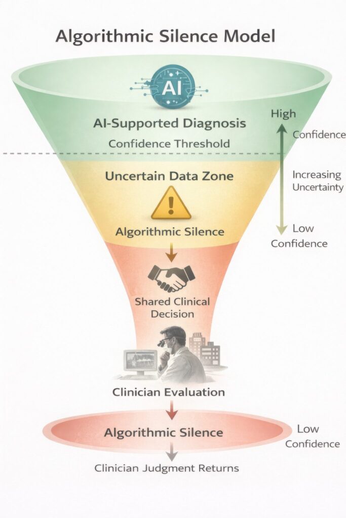 Algorithmic silence may be defined as the intentional withholding of automated diagnostic recommendation when model confidence, contextual validity, or ethical safety thresholds are not sufficiently satisfied. Silence functions as a designed safeguard embedded within clinical decision-support architecture, allowing uncertainty to become an actionable clinical signal.