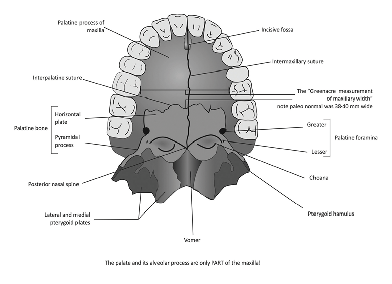 All doctors should measure the width of each patient’s palate from the lingual of the upper right first-year molar to the lingual margin of the upper left first- or six-year molar as a clinical marker in their diagnostic protocol. Very good maxillary width is 38 to 40 mm. Very poor maxillary width is 28 to 36 mm. The latter is the range usually seen clinically.
