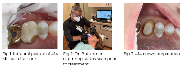 Clinical examination revealed a fractured mesial-lingual cusp on an existing porcelain crown on tooth #14. Radiographic examination confirmed a previous root canal treatment (RCT) with no concerns noted. An intraoral photograph was taken to document the cusp fracture.